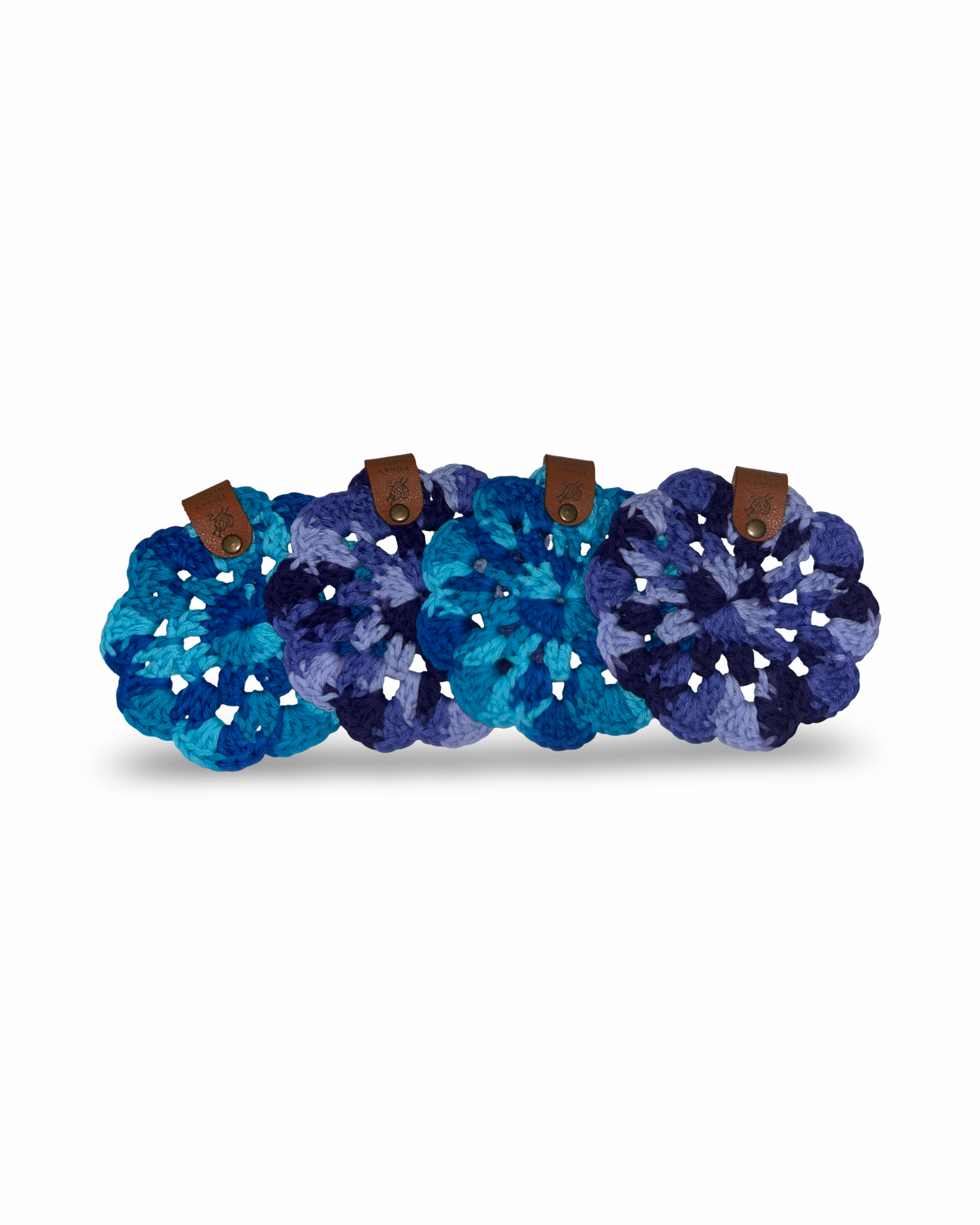 Heklet glassbrikker (coasters) 4 stk i nydelige sommerfarger. Laget av 100% bomull.