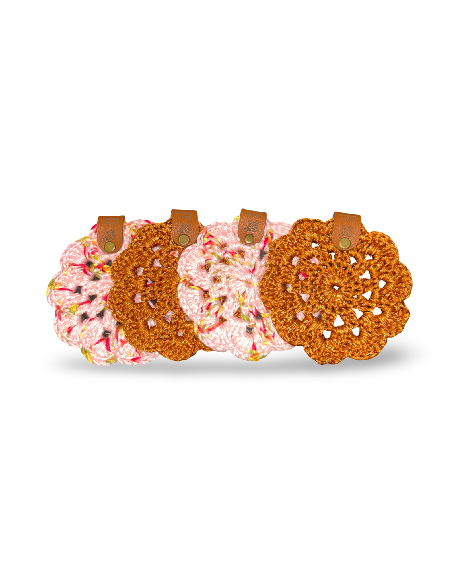 Heklet glassbrikker (coasters) 4 stk i nydelige sommerfarger. Laget av 100% bomull.