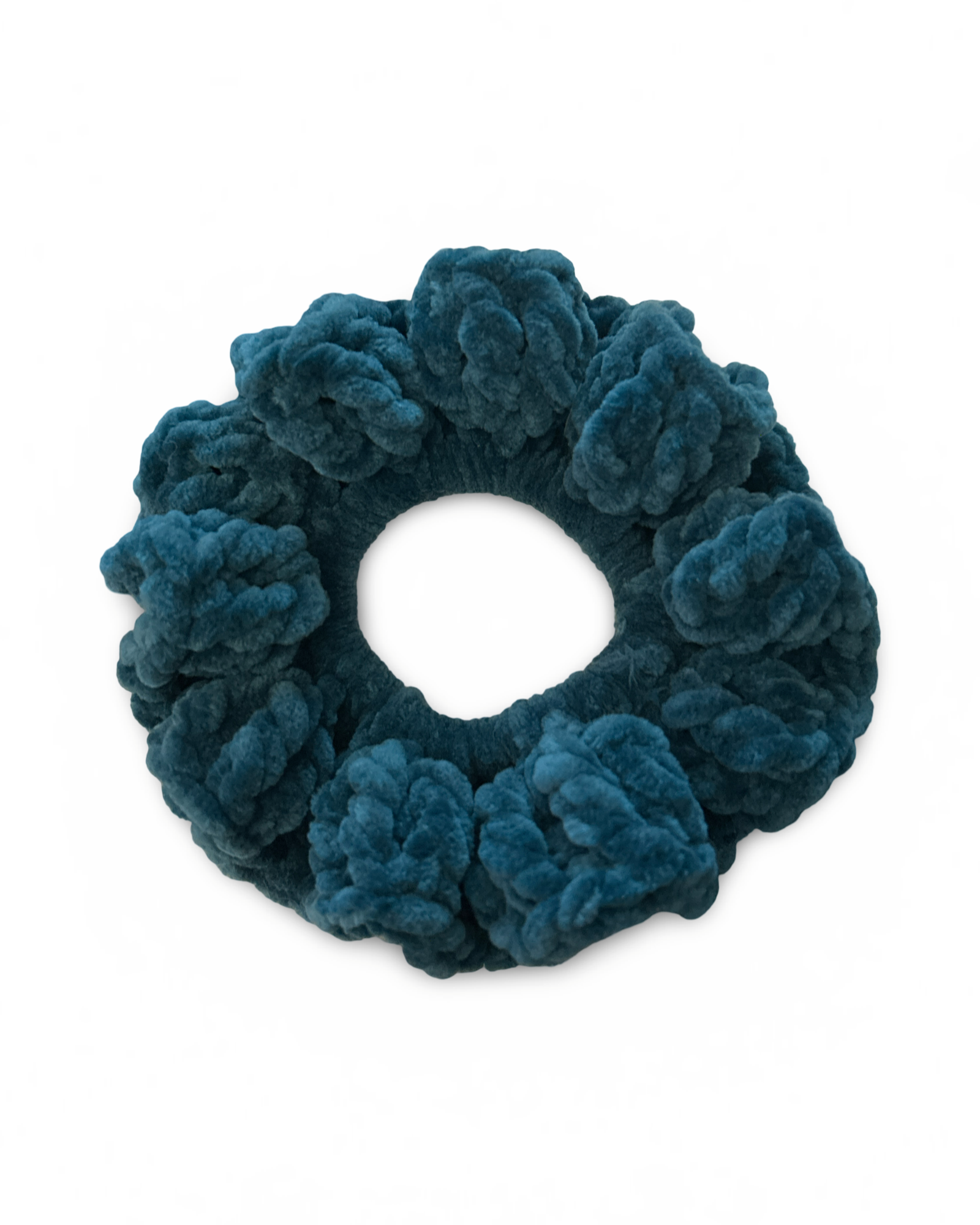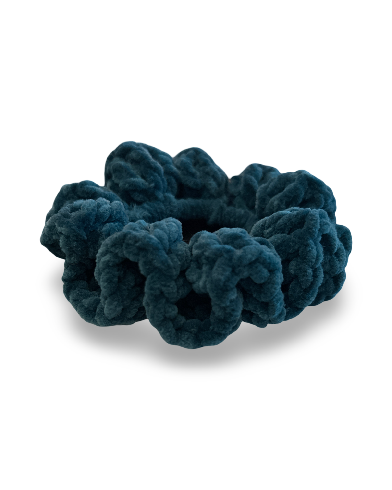 Fint scrunchie (hårstrikk) laget av mykt velvet garn.